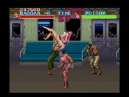 The English localization of the SNES port was censored for its content and features several differences from its Japanese Super Famicom counterpart: the first two bosses, Damnd and Sodom, were renamed Thrasher and Katana respectively; Belger's wheelchair was redrawn to look like an office chair; Poison, a trans woman with pink hair, and Roxy, a female with red hair,[9] were replaced with two male enemies named Billy and Sid;[10] all alcoholic references were removed, with two health-recovering items replaced; the line "Oh! My God", spoken by an enemy when his car is destroyed during the first bonus stage, was changed to "Oh! My Car"; the blood splash effect shown when a character is stabbed is replaced by a generic explosion;[11] and some of the darker skinned enemy characters were given lighter skin tones. The original soundtrack was ported for the Super NES by Toshio Kajino (credited as "Bull").
