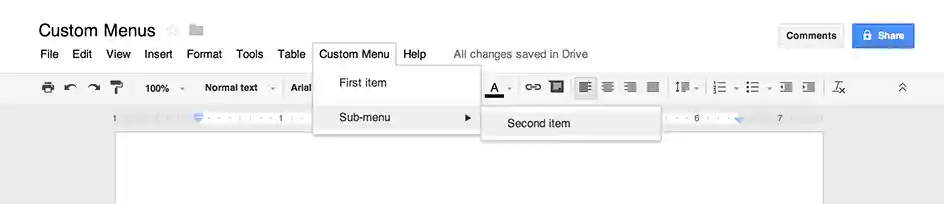 Apps Script can add new menus in Google Docs, Sheets, Slides, or Forms, with each menu item tied to a function in a script. (In Google Forms, custom menus are visible only to an editor who opens the form to modify it, not to a user who opens the form to respond.)