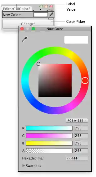void OnGUI() { matColor = EditorGUI.ColorField(new Rect(3, 3, position.width - 6, 15), "New Color:", matColor); if (GUI.Button(new Rect(3, 25, position.width - 6, 30), "Change!")) { ChangeColors(); } }