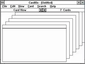 Windows 3.0 introduced some minor changes to the Cardfile user interface, changing the application's background from blue to white and adding an access bar below the menu, which displays the current view mode (card view or list view) and the number of cards in the file, as well as providing buttons to quickly move to the previous or next cards in order.