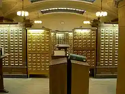 Dewey and others devised a system where books were organized by subject, then alphabetized based on the author's name. Each book was assigned a call number which identified the subject and location, with a decimal point dividing different sections of the call number. The call number on the card matched a number written on the spine of each book.[17] In 1860, Ezra Abbot began designing a card catalog that was easily accessible and secure for keeping the cards in order; he managed this by placing the cards on edge between two wooden blocks. He published his findings in the annual report of the library for 1863 and they were adopted by many American libraries.[13]