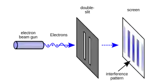 Another consequence of the mathematical rules of quantum mechanics is the phenomenon of quantum interference, which is often illustrated with the double-slit experiment. In the basic version of this experiment, a coherent light source, such as a laser beam, illuminates a plate pierced by two parallel slits, and the light passing through the slits is observed on a screen behind the plate.[8]: 102–111 [2]: 1.1–1.8 The wave nature of light causes the light waves passing through the two slits to interfere, producing bright and dark bands on the screen – a result that would not be expected if light consisted of classical particles.[8] However, the light is always found to be absorbed at the screen at discrete points, as individual particles rather than waves; the interference pattern appears via the varying density of these particle hits on the screen. Furthermore, versions of the experiment that include detectors at the slits find that each detected photon passes through one slit (as would a classical particle), and not through both slits (as would a wave).[8]: 109 [9][10] However, such experiments demonstrate that particles do not form the interference pattern if one detects which slit they pass through. This behavior is known as wave–particle duality. In addition to light, electrons, atoms, and molecules are all found to exhibit the same dual behavior when fired towards a double slit.[2]
