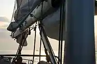 A gnav (the word vang spelt backwards) is an inverted vang. It is a rigid strut that extends obliquely upward from the boom to the mast, exerting a force that pushes down on the boom. As the fixing point of the gnav on the boom is hauled inwards towards the mast, the downward force on the boom increases. A gnav offers more uncluttered space beneath the boom when compared to a vang.