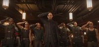 Rude, paired with Elena while Reno was on leave due to injuries, was tasked by Rufus to track the black-robed figures and locate Sephiroth. They navigated through the Mythril Mine towards Junon and encountered Cloud's party during "Deeper into Darkness" in Final Fantasy VII Rebirth. During the fight, Rude kept Elena focused and apologized to Aerith until Tseng arrived to cover their escape.[34] Upon arriving in Junon for Rufus' inauguration in "Dawn of a New Era", Rude went to a club for bald people. When a disguised Cloud, Tifa, and Aerith entered, he insisted that they remove their helmets if they wanted to join them, reminded them of the club's rules, and wished them luck with the inauguration parade.[35]