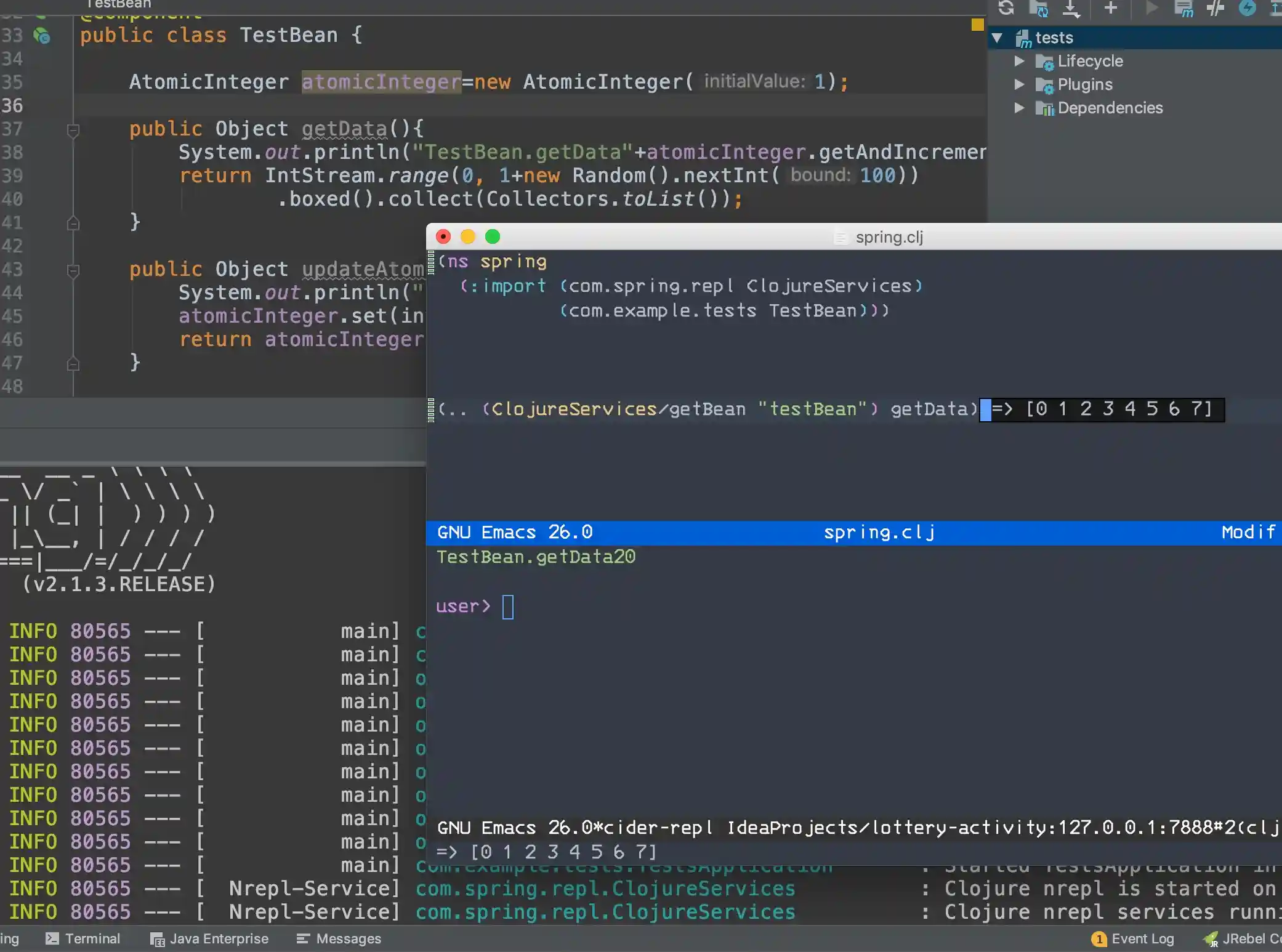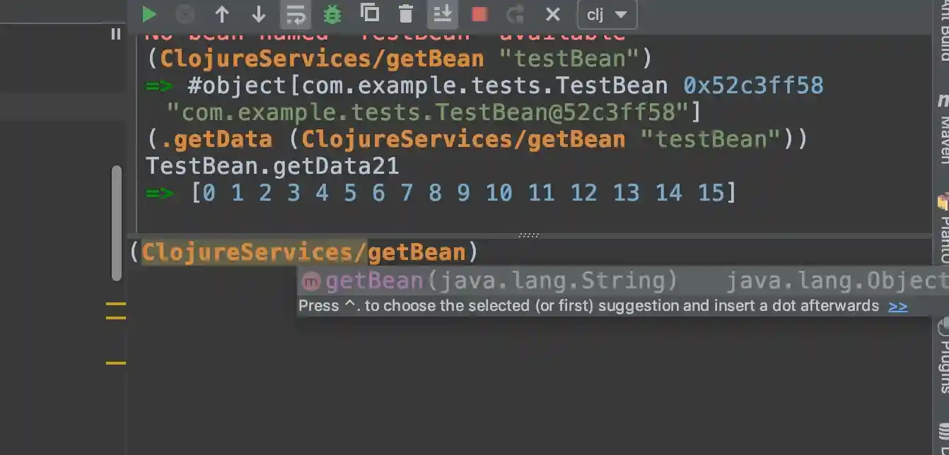 结合Jrebel可以实现JavaCode热加载并且Repl不断开,但是在终端里并没有代码补全,如果想体验补全的快感建议使用Emacs+Cider环境.