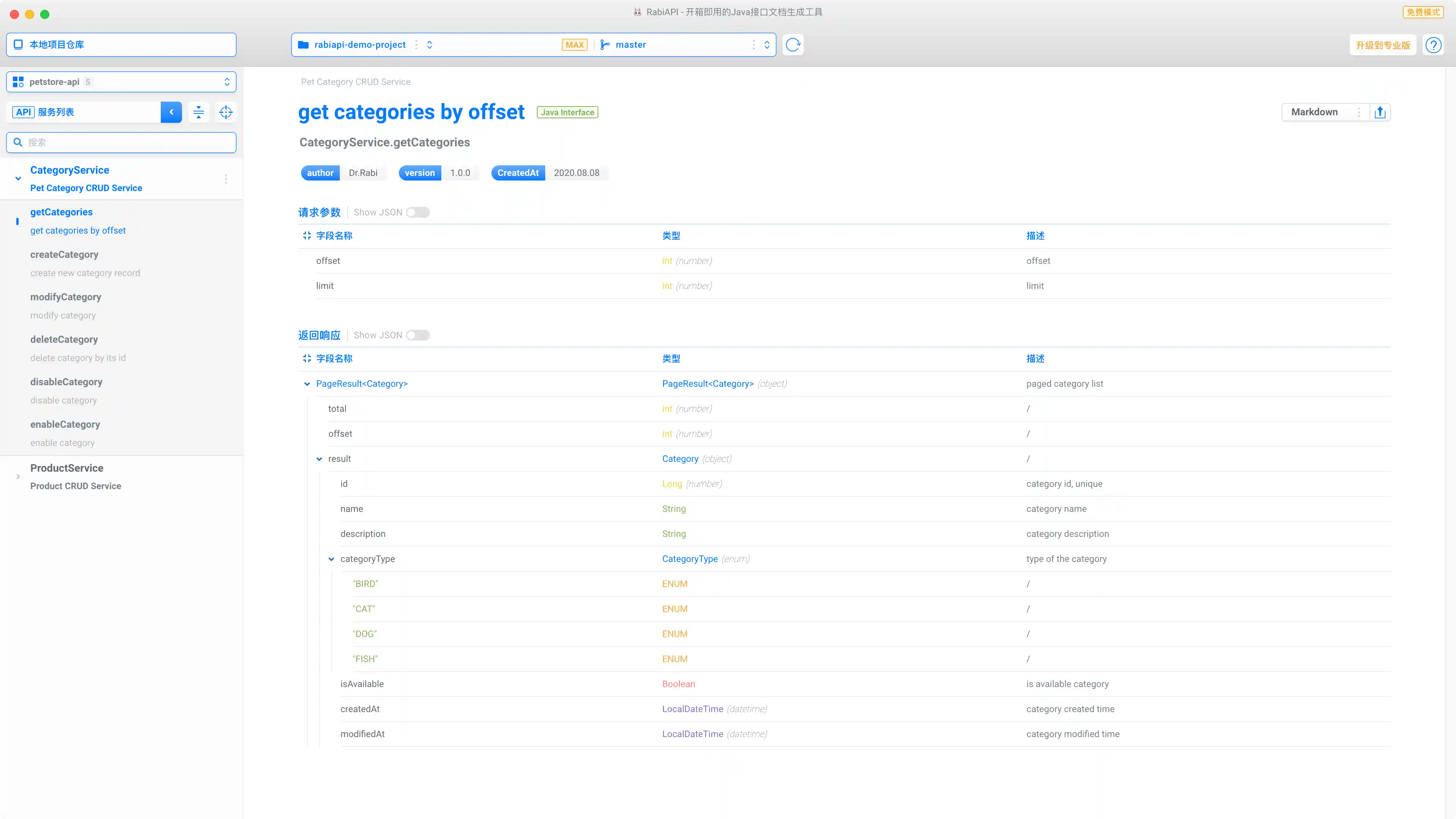 所有的接口类型(interface/spring/jax-rs)都可以导出为markdown格式