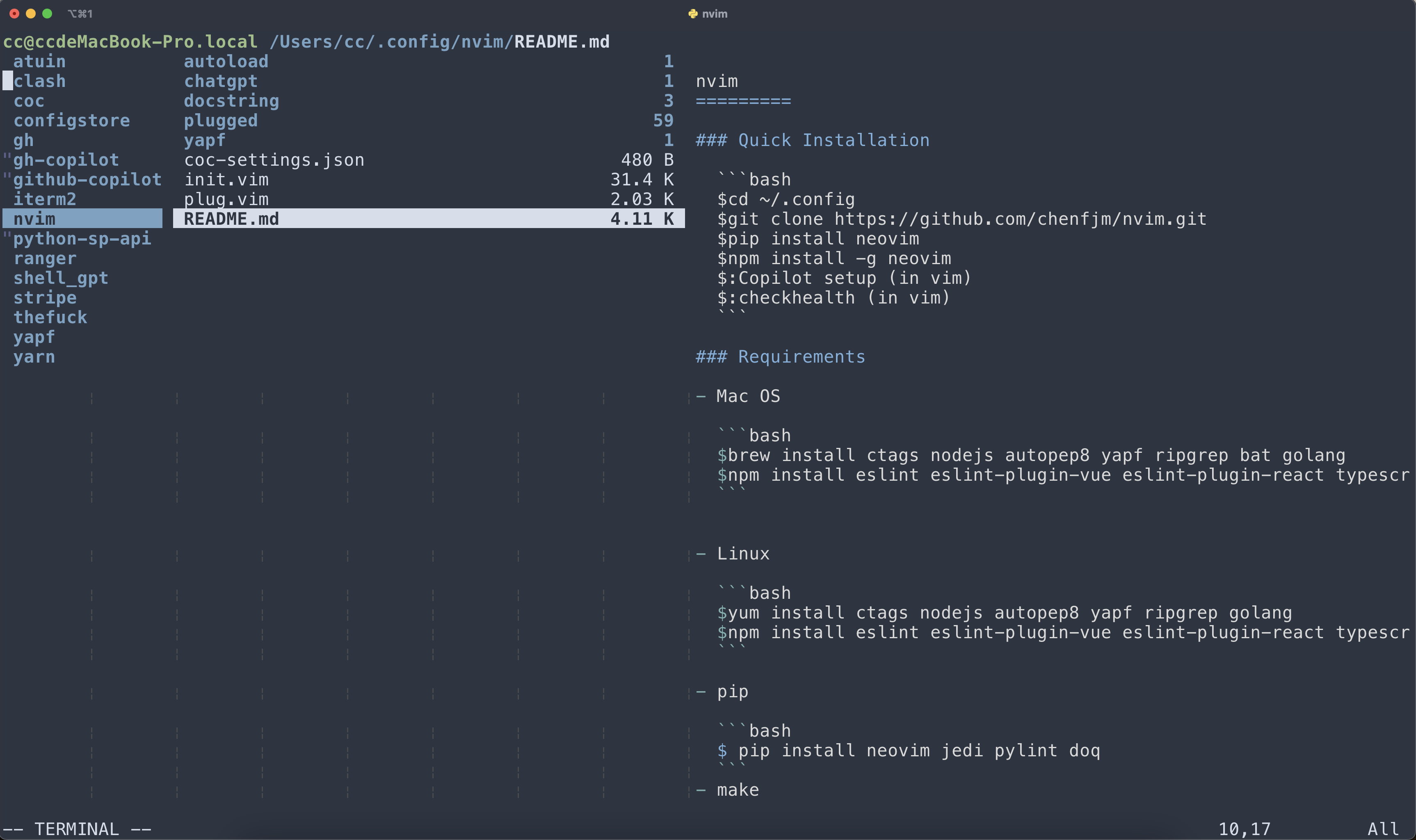 $cd ~/.config $git clone https://github.com/chenfjm/nvim.git $pip install neovim $npm install -g neovim $:Copilot setup (in vim) $:checkhealth (in vim)