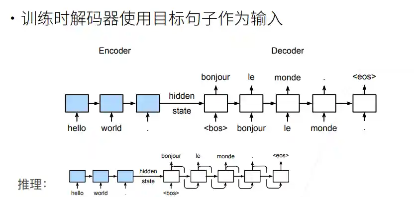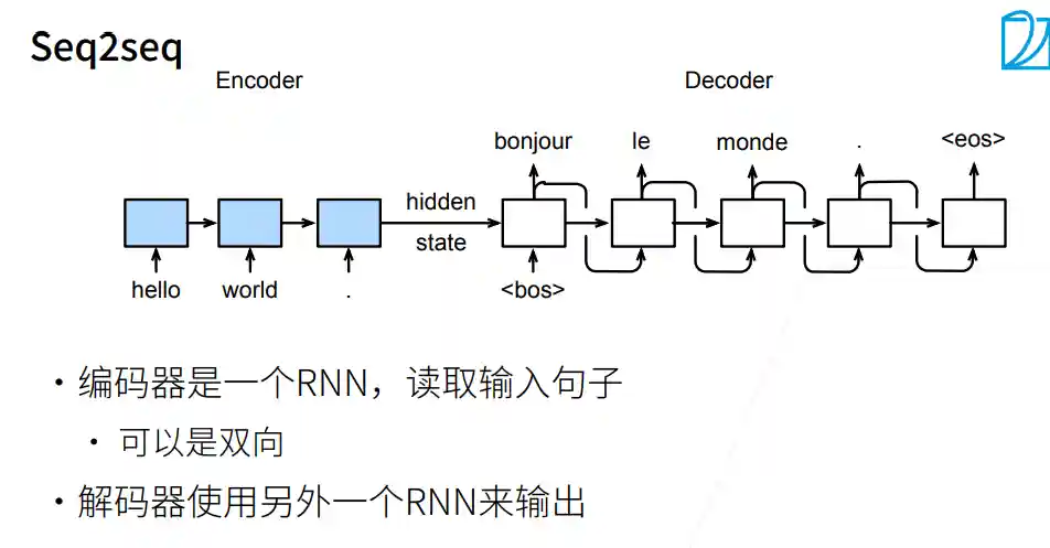 编码器RNN可以是双向,由于输入的句子是完整地,可以正着看,也可以反着看;而解码器只能是单向,由于预测时,只能正着去预测。