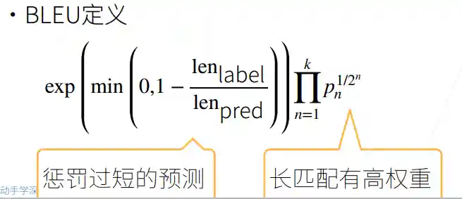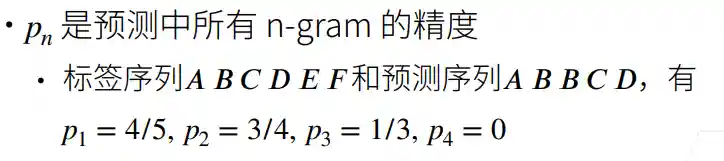 wn的选择:李沐老师课程中是采用了$\frac{1}{2^n}$作为加权因子,n越大,加权因子越小,但由于pn<1,赋予的权重越大,即长匹配具有更高的权重。而宗老师的书中所述:在BLEU的基线系统中取N=4,wn=1/N,也可以参考。