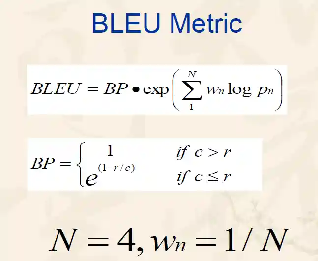 BP惩罚因子:为了惩罚过短的句子,由于过短的句子基数小,精确率容易提升,所以加上一个BP乘子,当预测句子长度<参考句子长度,则BP<1。