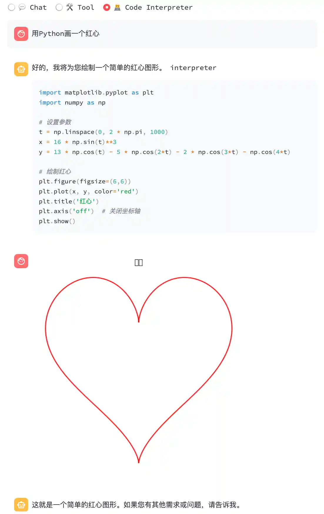 $ ./build/bin/main -m models/chatglm3-ggml.bin --top_p 0.8 --temp 0.8 --sp examples/system/code_interpreter.txt -i