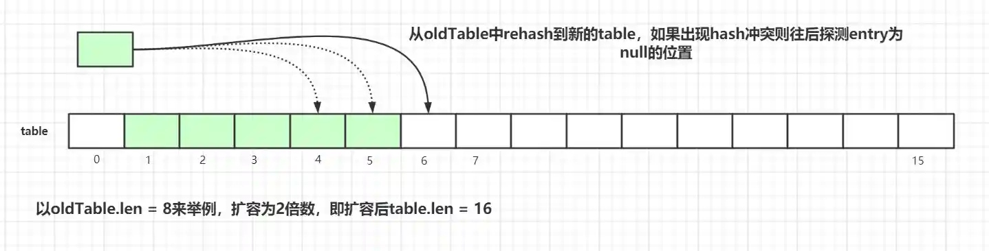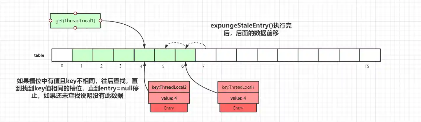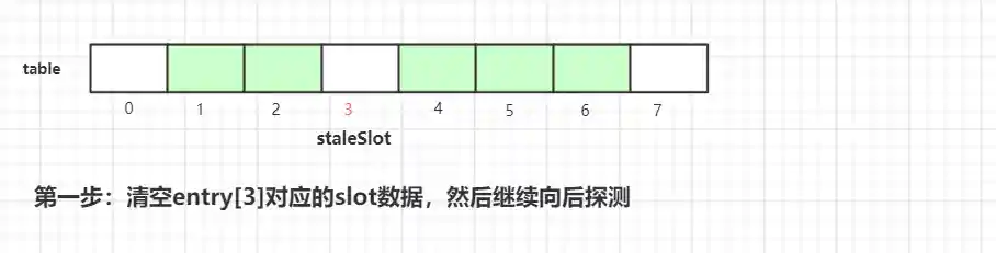 探测式清理是以当前Entry 往后清理,遇到值为null则结束清理,属于线性探测清理。