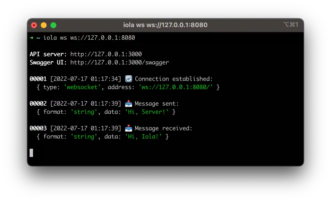 iola tries to simplify socket server testing and support the most popular socket clients. The main way to interact with the tool is the REST API. This approach allows you to use the rich functionality of modern REST clients to work with sockets.