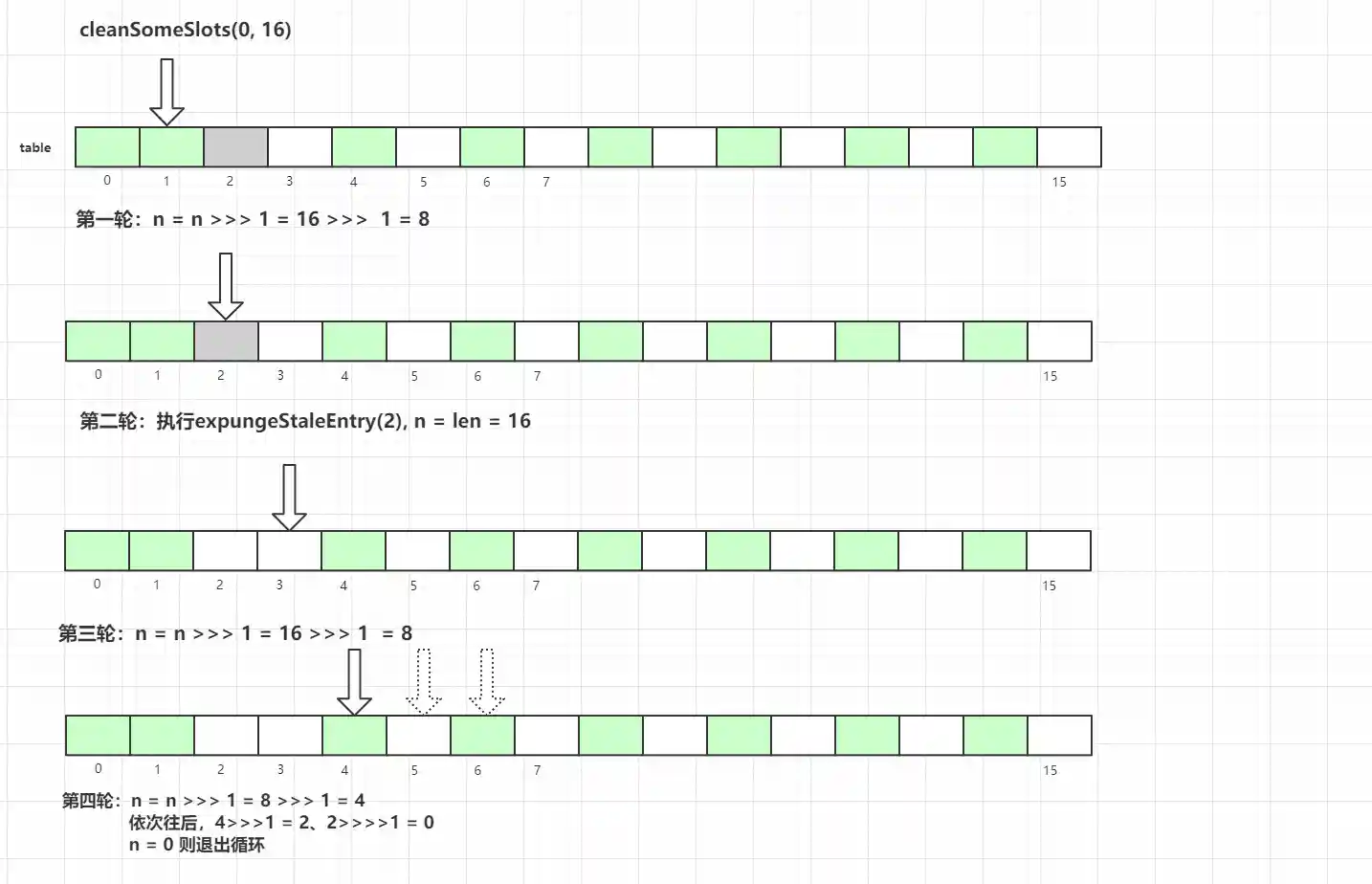 探测式清理是以当前Entry 往后清理,遇到值为null则结束清理,属于线性探测清理