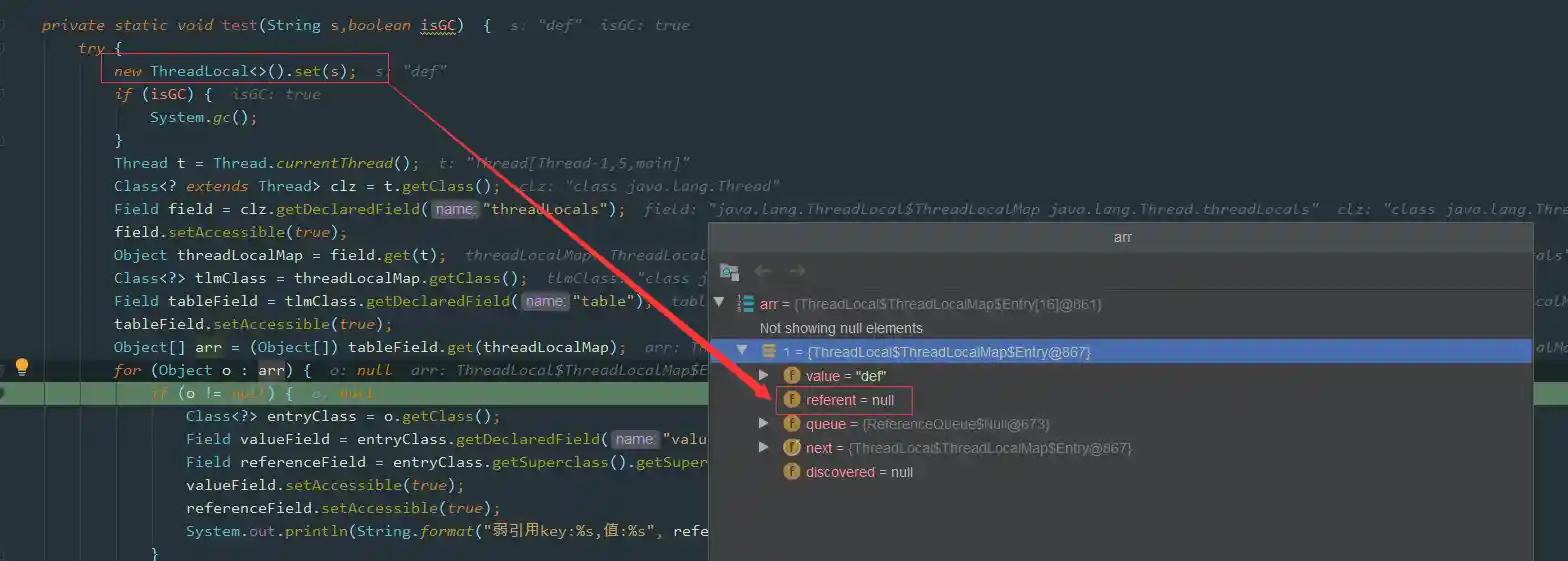 所以这里在GC之后,key就会被回收,我们看到上面debug中的referent=null, 如果改动一下代码: