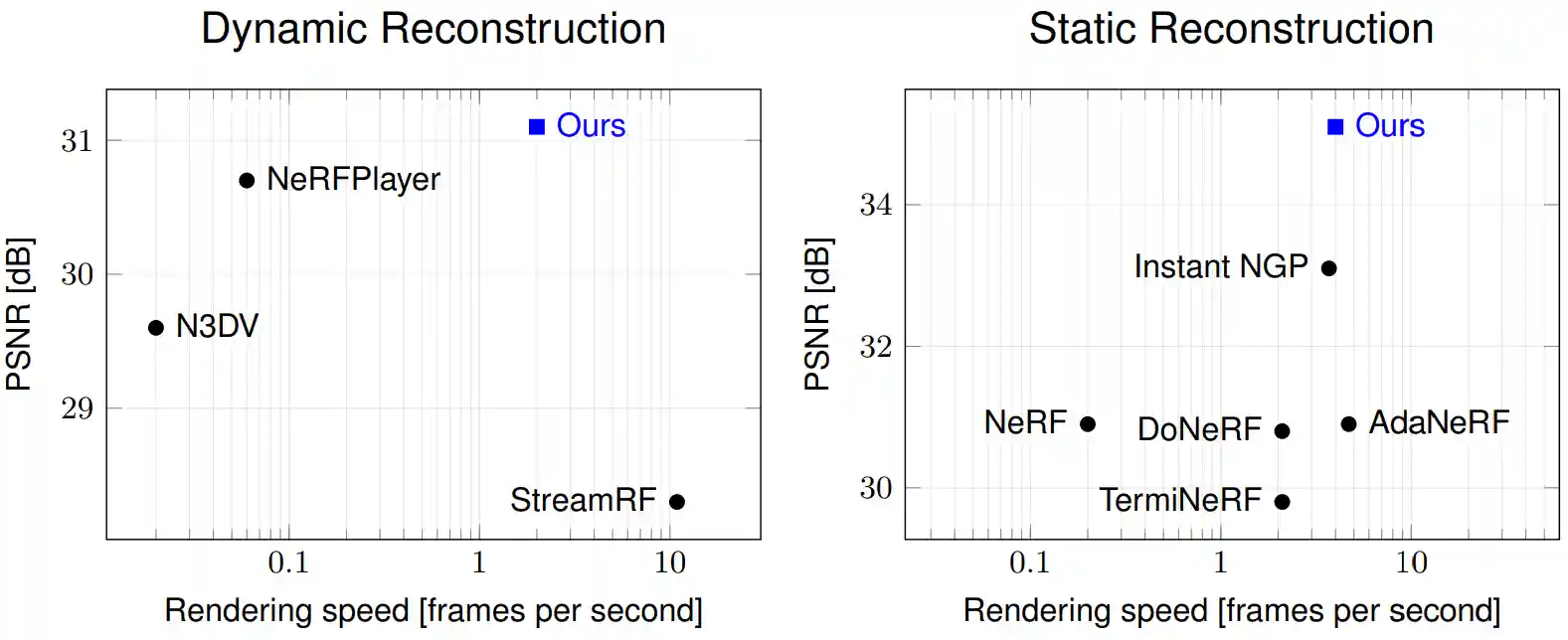 We show real-time demos of our approach at 512x512 pixel resolution applied to both dynamic and highly-view-dependent static scenes below. You can run our method and these real-time demos using our codebase.