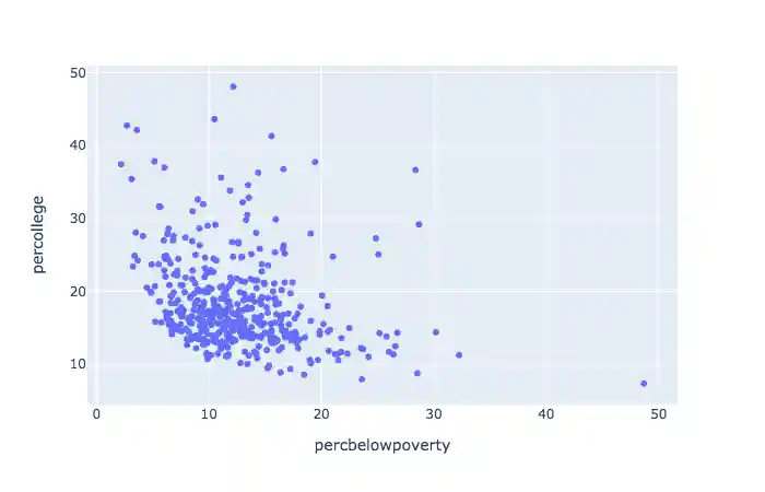 plt = px.scatter(midwest, x = 'percbelowpoverty', y = 'percollege')