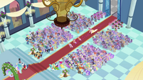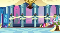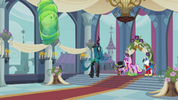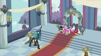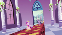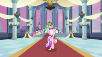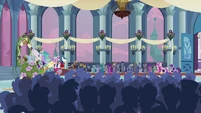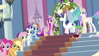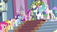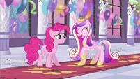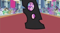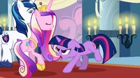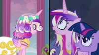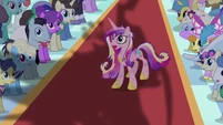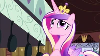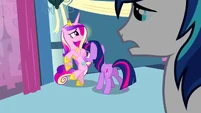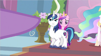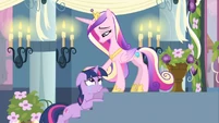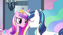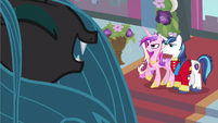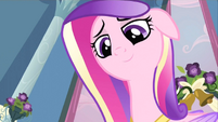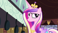 Rarity also looks pleased, but Cadance does not seem amused.
