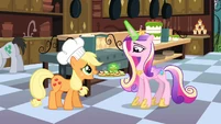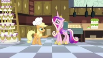 Applejack looks pleased, but Cadance looks disturbed.
