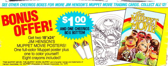 In 1979, Cheerios promoted The Muppet Movie with a series of trading cards printed on the back of the box. There were 12 cards in all, printed in four sets of three. There was also a mail-in offer for a small poster of the Muppet cast.