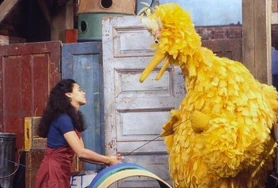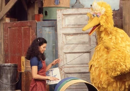Big Bird continues holding the string, getting tired as time passes. Maria approaches him, and Big Bird angrily assumes she's about to give him more advice like the other grownups did, but she just wants to let him know that the barrel is dry, and the paint isn't wet anymore. Big Bird happily vows to only listen to Maria from now on. |