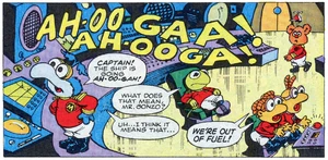 - In the February 28, 1982, installment of The Muppets comic strip (reprinted in Moving Right Along!, 1984), Fozzie Bear refers to the daunting task of cleaning his room as "To boldly go where no bear has gone before!," a reference to the title sequence of the original Star Trek television series.