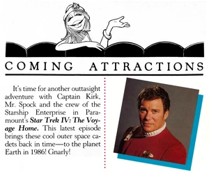 - In the Winter 1987 issue of Muppet Magazine, Janice reviews Star Trek IV: The Voyage Home, commenting that its premise of traveling back in time to 1986 Earth is "gnarly." A photo of William Shatner as Captain Kirk is featured.